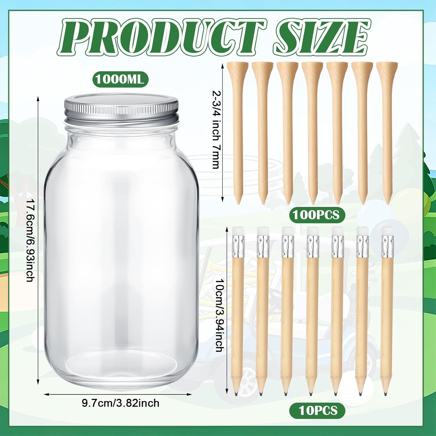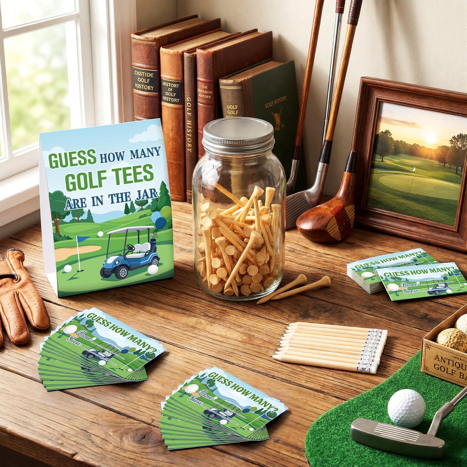 features: thoughtful golf enthusiast gift: this set is an excellent gift choice for golf lovers, especially those who are going to prepare a golf-themed party. it is practical and decorative, and can help the recipient better organize the party interactive links, saving them the trouble of preparing related items separately. it is a thoughtful and practical party preparation gift that can convey your care and blessings, and is also suitable for giving as a small gift in golf club exchanges, friend gatherings or holiday gifts, leaving a deep impression on the recipient with its exquisite design and practical functions. interactive entertainment value: the set is designed with strong interactive functions, and the eye-catching sign can easily guide guests to participate in the interactive game of "GUESS HOW MANY GOLF TEES ARE IN THE jar". the guessing cards are simple and clear, which is convenient for guests to fill in their answers, and the matching pencils make the participation process smoother. this interactive game can effectively mobilize the enthusiasm of all guests, promote communication and interaction between guests, break the awkward atmosphere, and make the party more lively and interesting, leaving a happy memory for every participant and making the party more lively and unforgettable. specifications: material: wooden golf tees: bamboo wood card: paper color: multicolor size: guessing cards: 2 x 3.5 inch mason jar: 1000 ml golf tees: 2-3/4 inch/ 7 mm standing sign: 5 x 7 inch pencils: 3.94 inch/10 cm package includes: 50 x guessing cards 1 x mason jar 100 x wooden golf tees 1 x standing sign 10 pencils notes: manual measurement, please allow slight errors on size. the color may exist a slight difference due to different screen displays