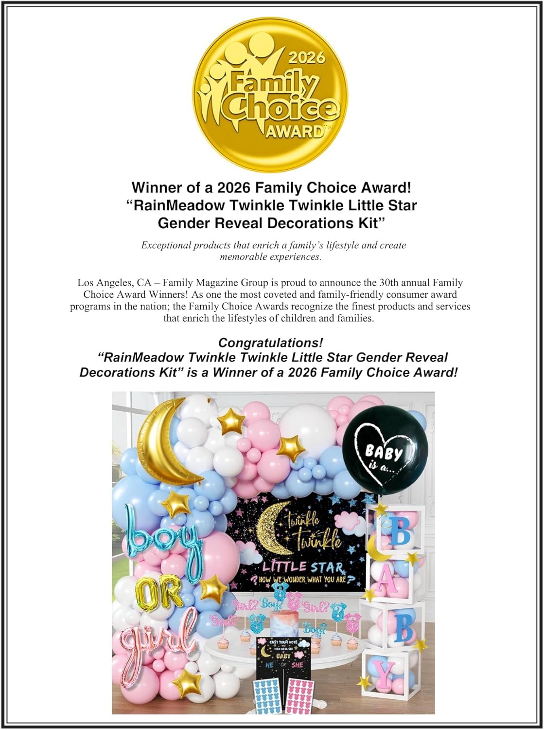 | Included Components | "Boy or Girl" Foil Balloon, Twinkle Twinkle Little Star Gold Glitter Banner, Fabric Backdrop, Gender Reveal Balloon, Blue and Pink Confetti, Gender Reveal Party Game, Girl Boy Balloon Boxes, Latex Balloons, Letters, Gold Stars and Moon Cutouts, Cupcake Toppers, Star and Moon Foil Balloon, Balloon Garland Kit |
