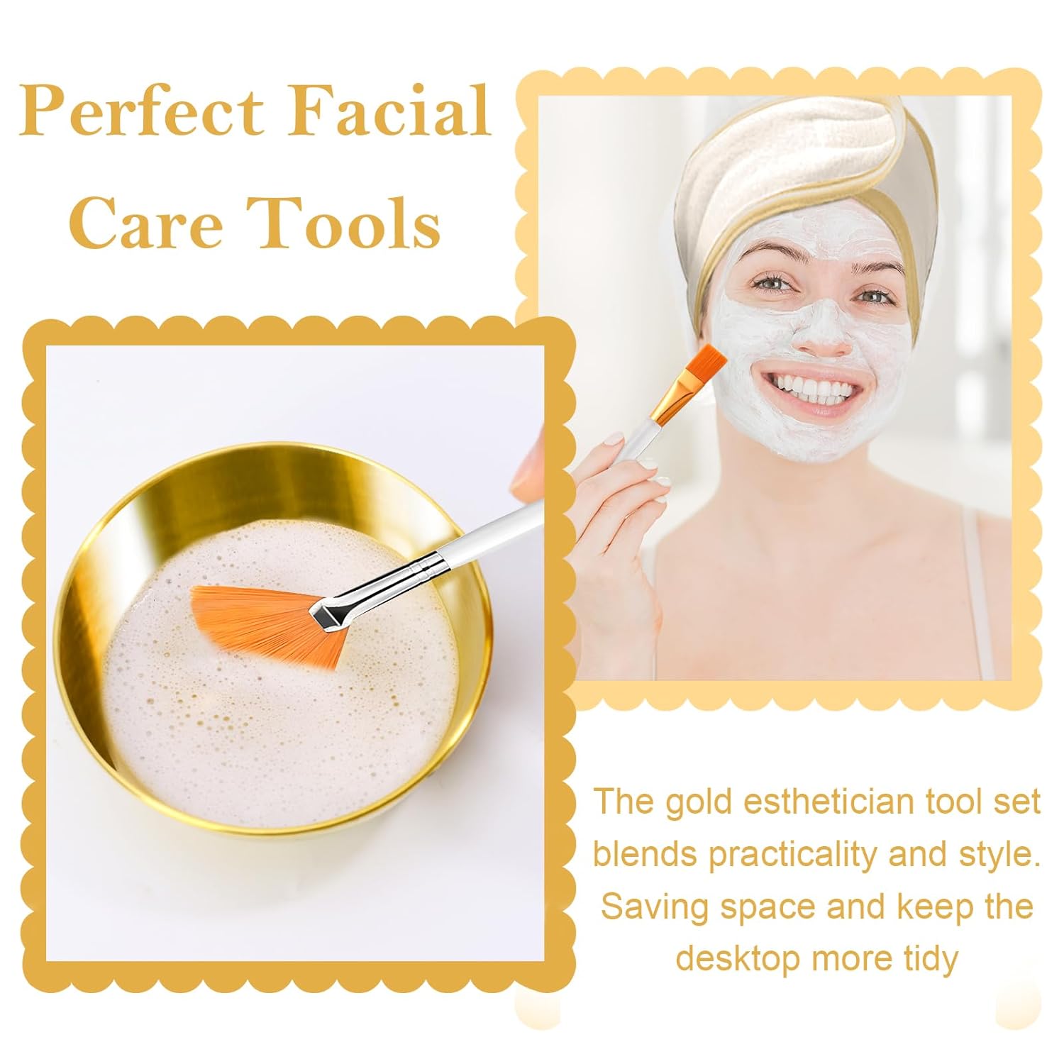 26 Gold Esthetician Supplies 3 Fan Brushes Esthetician 3 Facial Mask Mixing Bowls Large Gold Serving Bowls 3 Facial Flat Brushes Skincare Tray 3-Section Serving Tray 12 Facial Sponges 2 Spa Headbands Package:26 Color: Gold Size:3.5x1.2 inch Facial Mask Mixing Bowls, 6x1.8inch Fan Brushes, 6.7X0.8 inch Facial Flat Brushes, 9x3.54 inch Skincare Tray ,8x3.15 inch 3-Compartment Serving Tray 3.15 inch Sponges 23.6x3.15 inch Hairbands,7.9x3.54 inch Gold Bowls for Facials Application: Salon