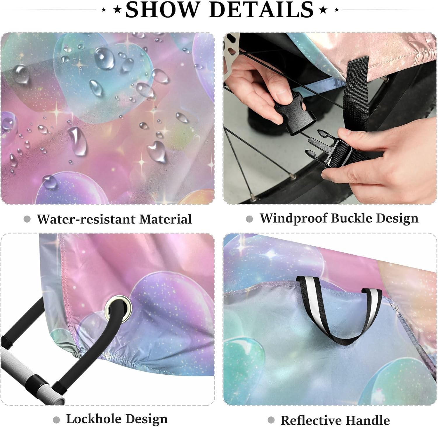 Protect your bicycle in style with our premium bike tarp, engineered for maximum defense against harsh elements. Unlike basic covers, we use specially engineered umbrella waterproof fabric - the same advanced material used in high-end rain umbrellas - delivering superior performance with unique visual appeal. Sun & Heat Defense Our fabric creates a physical cooling barrier that actively lowers your bike's temperature by: Blocking 95%+ harmful UV rays to prevent paint fading Providing exceptional shading & heat insulation (up to 20℉/11℃ reduction vs direct sun) Offering SPF 50+ equivalent protection for sensitive components Rain & Dust Protection Water-repellent coating causes rain to bead and roll off Tightly woven fabric acts as dustproof barrier for long-term storage Prevents moisture buildup with breathable side panels (prevents condensation) User-Focused Design LOCK ACCESS HOLE at front wheel enables secure locking without removing cover ADJUSTABLE BUCKLE STRAP at rear wheel anchors cover during strong winds Reflective safety strips on handles enhance nighttime visibility Ultra-lightweight (23 oz) folds into included pouch Unbeatable Aesthetics Choose from over 1,000 designer patterns - from sleek geometrics to vibrant nature motifs - transforming your bike into a street-style statement while competitors offer only solid colors.