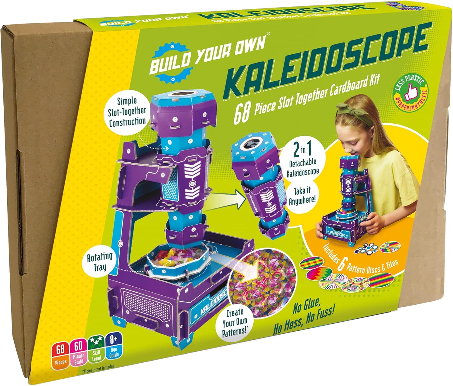 Watch vibrant colors and patterns change before your eyes with the Build Your Own inspired Kaleidoscope. Insert the colorful printed pattern disc of your choice, then twist and rotate your kaleidoscope tube to create amazing displays. There is even a convenient storage compartment for your items. You can also take off your kaleidoscope tube to explore on the go! A vibrant, colorful design, this retro kaleidoscope also looks chic. Easy to install thanks to plug-in techniques - there is no glue, no mess, no fuss. Everything you need is included in the kit - just follow the instructions, push out the pre-cut parts, build and you're ready to go! Children will learn how a kaleidoscope works when building, and they will be encouraged to experiment and use their creative imagination to have fun. Our kaleidoscope is suitable for children aged 8 and up and is best enjoyed as a family experience. Made from cardboard, the Build Your Own Kaleidoscope is very fun and appealing to play with. Clean, interlocking cardboard construction. - 60 minutes assembly. - Skill level rating 3 out of 5 stars. - 59 press-out parts (plus 3 x mirrors, 6 x printed pattern discs and 12 x pattern tiles). - Explains children about symmetry and how a kaleidoscope works while playing. Designed in the UK. Safety instructions: Recommended for ages 8 and up. Warning: Not suitable for children under 3 years. Warning: Small parts. Warning: Choking hazard. Warning: Do not stare directly at a light source. Warning: Do not stare directly into the sun. Warning: Use only in stationary condition to prevent tripping or falls Do not leave the kit unattended, especially for younger children who may not be familiar with the above risks. To be used under the direct supervision of an adult. Keep this packaging for future reference.