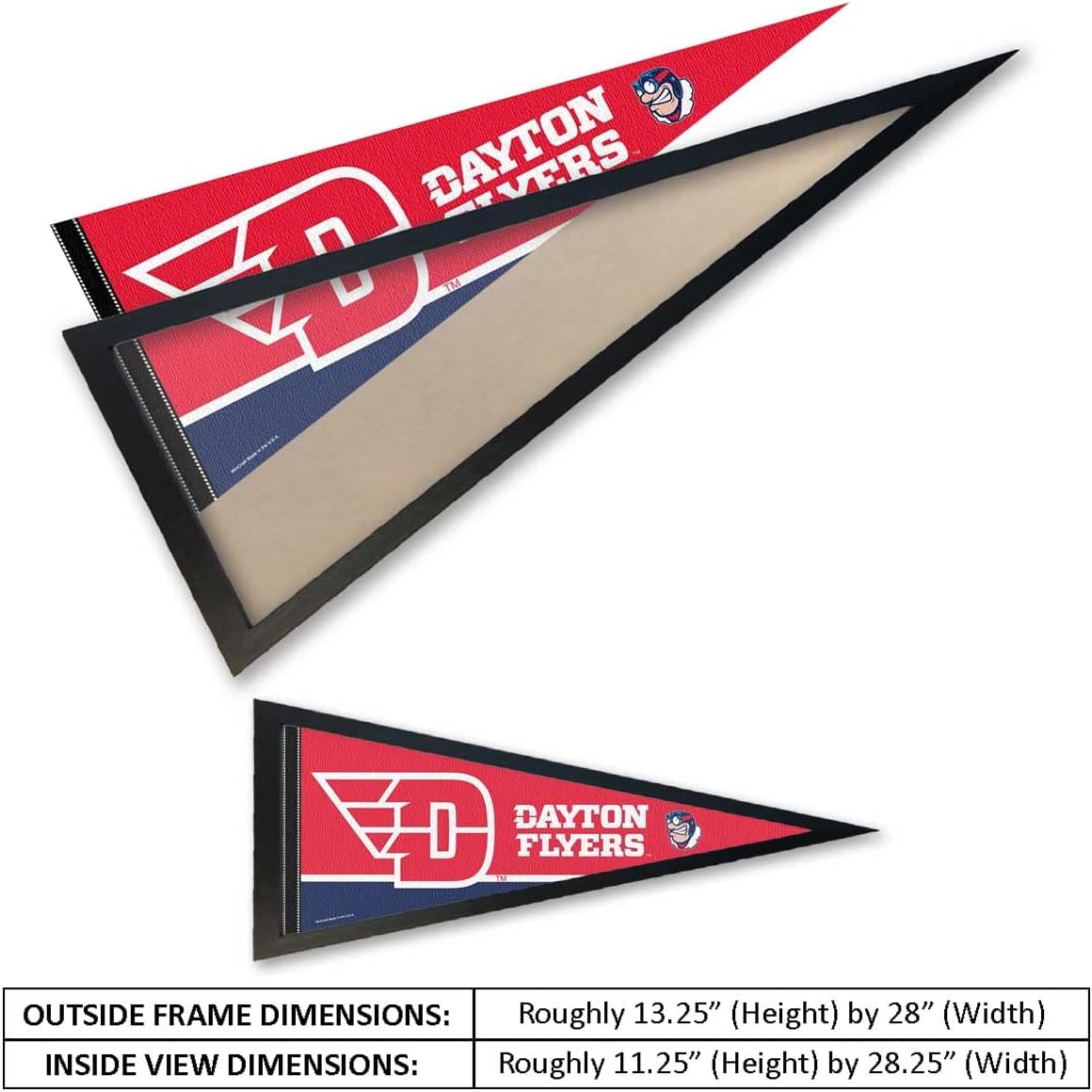Dayton Flyers New Logo Pennant and Wood Pennant Frame includes a 12x30 inch soft poly felt Officially Licensed pennant and the recommended Pennant Frame which is made of solid poplar wood.The pennant is full size, single sided screen printed, and is ideal to display on any wall of your home, office, gameroom, or as a banner. The Pennant Frame is 13.25 x 34.25 inches, made of poplar wood moulding, stained black satin, includes a plexiglass front, and fits this pennant perfectly. Please Note: The pennant frame has a protective plastic film on both sides of the plexiglass. Please peel off from both sides when ready to use.