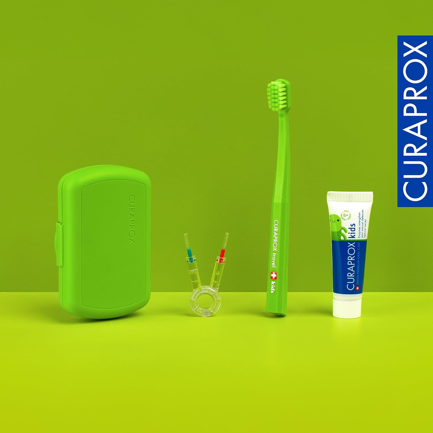 Curaprox Travel Set kids green, travel toothbrush, interdental brush, toothpaste 10ml, travel box