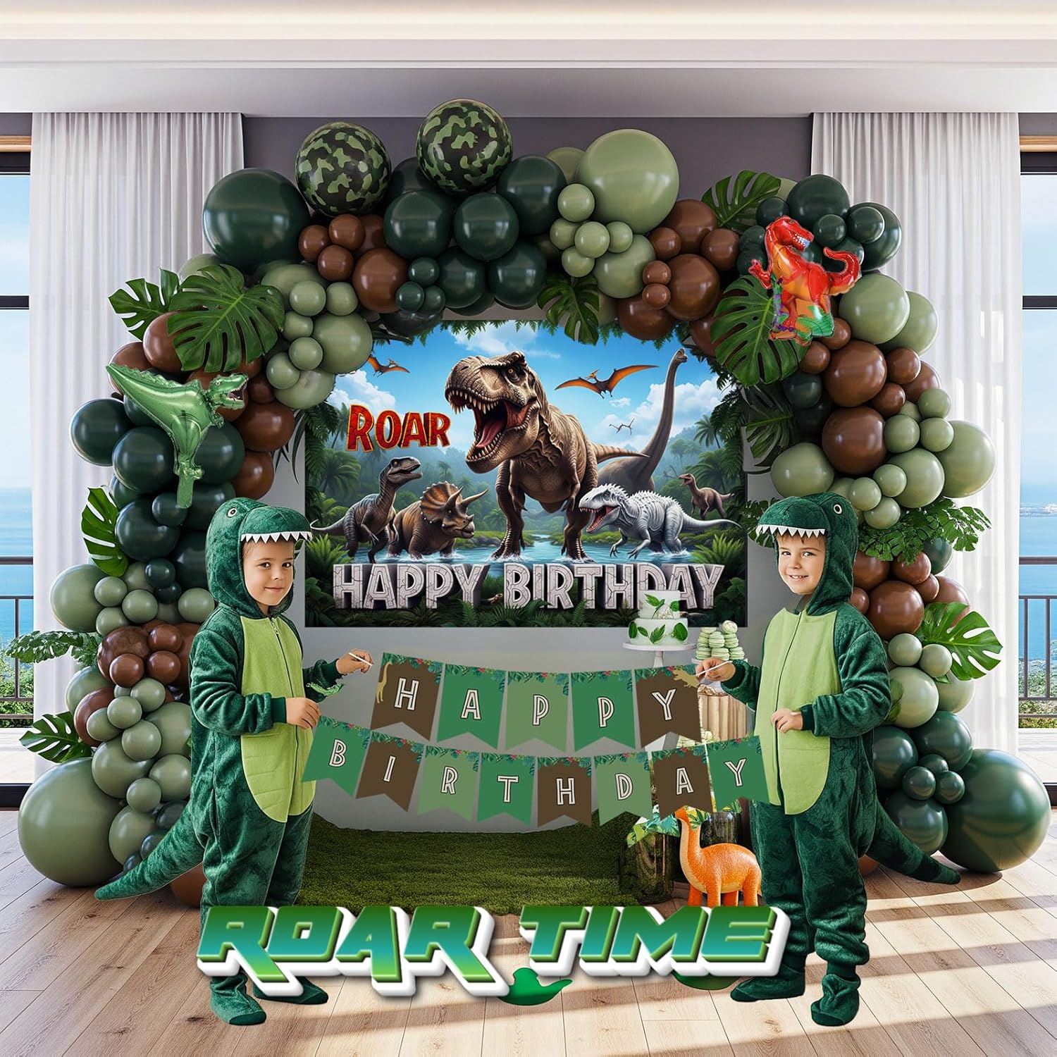 Have a blast with our dinosaur birthday party set! This premium set includes a stunning balloon garland with a rich mix of dark green, sage green, and brown balloons, along with eye-catching jungle print balloons. The highlight is a selection of adorable dinosaur foil balloons, including an all-in-one set that brings the prehistoric world to life. Complete with a custom "Happy Birthday" banner, vibrant backdrop, and dinosaur footprint stickers, this set is designed to create a truly memorable party.