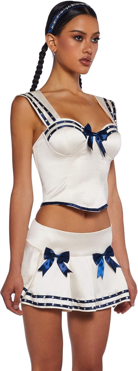 Cuz let’s set sail baby! The Anchors Aweigh Costume Set by Dolls Kill is a charming vintage sailor outfit featuring a crop top with a sweetheart neckline, structured boning, underwire bust cups, bow appliques, and a zippered closure. The set is complete with a matching pleated skirt and hat, giving you a full sailor look perfect for costume parties, themed events, or just embracing your nautical side. Made from high-quality materials, this costume ensures both comfort and durability. Hand wash in cold water and hang dry to keep your costume looking fresh and fabulous. Get ready to set sail in style with this adorable ensemble!