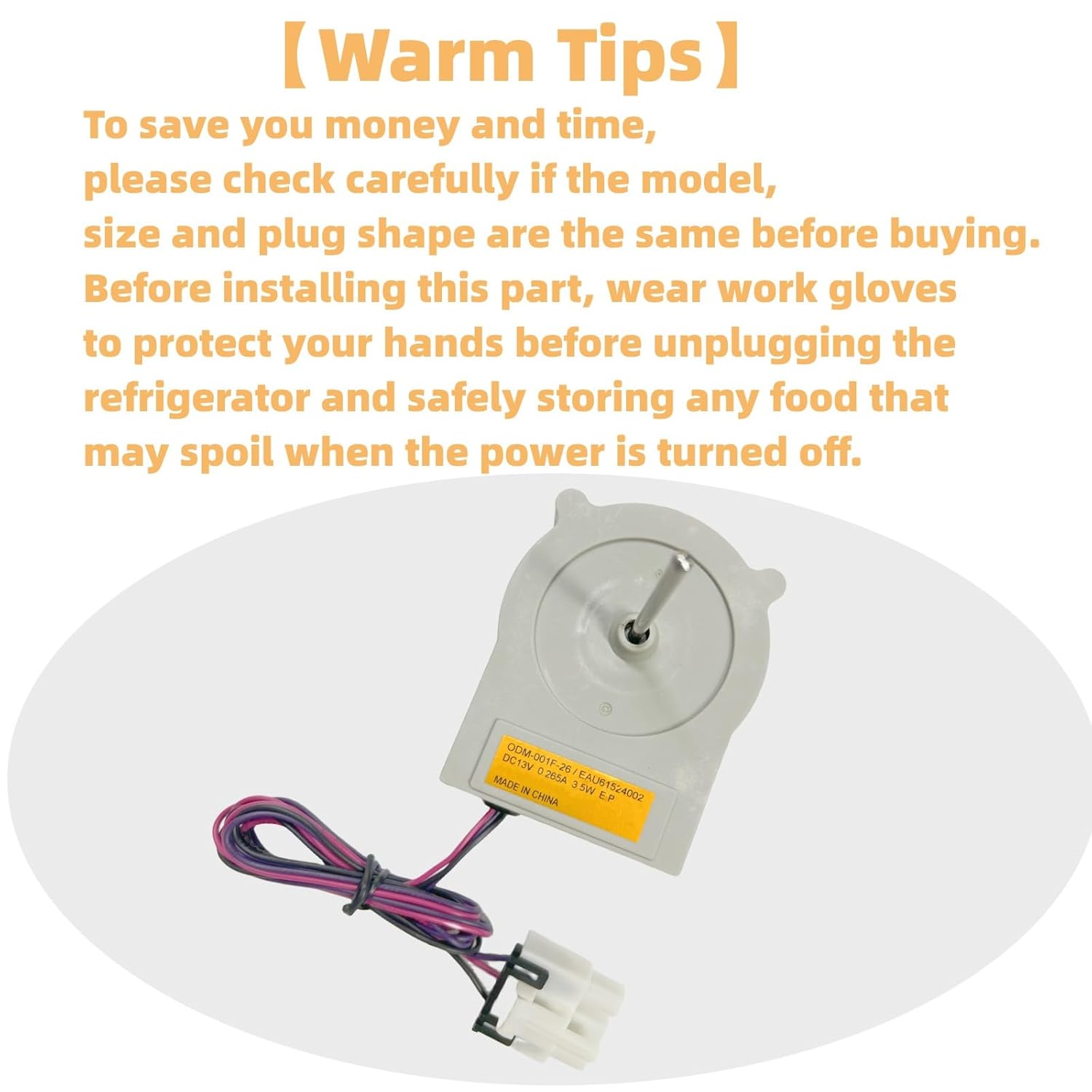 Package include: 1piece Refrigerator Condenser Fan MotorWarm Tips:To save you money and time,please check carefully if the model, size and plug shape are the same before buying.Before installing this part, wear work gloves to protect your hands before unplugging the refrigerator and safely storing any food that may spoil when the power is turned off.