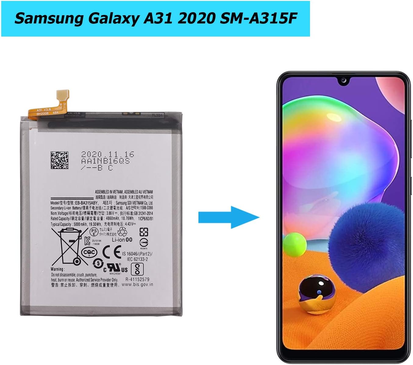 Item Specs:Model Number:EB-BA315ABYCapacity: 4860mAhVoltage: 3.85VCompatibility: for Samsung Galaxy A31 2020 SM-A315F A315F Packaging: 1 x battery, 1 x toolkitTips for installation: 1. Replacing the battery or the screen panel may require some tech skills, you may need to pay some fees for technician assistance.2. The connecting points on the battery and screen panel is very fragile, be more careful when replacing it, make sure your hands are dry when install the battery or the screen.3. Check if the battery or the screen works well by connecting the cable before assemble your phone.4. Do not throw out the packaging box, keep it for at least 30 days if you got any issues, so that it would be more convenient for us to help you.Contact usSend us a message on Amazon whenever you have questions or get any issues with our product, our customer service team will answer you within 24hrs, your patience is highly appreciated.