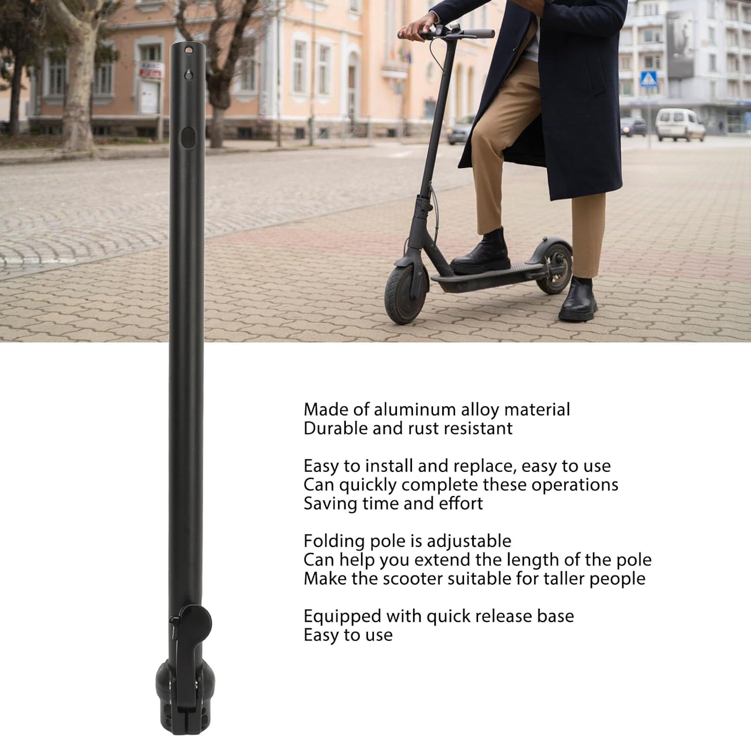 1. Aluminum Alloy Material: The electric scooter folding post is made of aluminum alloy material, which is sturdy, rust resistant, and has a long service life.2. Install and Replace: The electric scooter folding pole is easy to install and replace, convenient to use, and you can quickly complete these , saving time and energy.3. Adjustable Design: The 8.5 inch electric scooter folding post is adjustable, which can help you extend the length of the rod, making the scooter suitable for taller people.4. Quick Release Base: The aluminum alloy electric scooter folding post adopts a folding design and is equipped with a quick release base, making it easy to use.5. Good Workmanship: Exquisite workmanship, beautiful appearance, reliable performance, providing you great using experience.Specification:Item Type: Electric Scooter Folding PoleProduct Material: Aluminum AlloyWeight: Approx. 882g / 31.1ozPackage List:1 x Electric Scooter Folding Pole