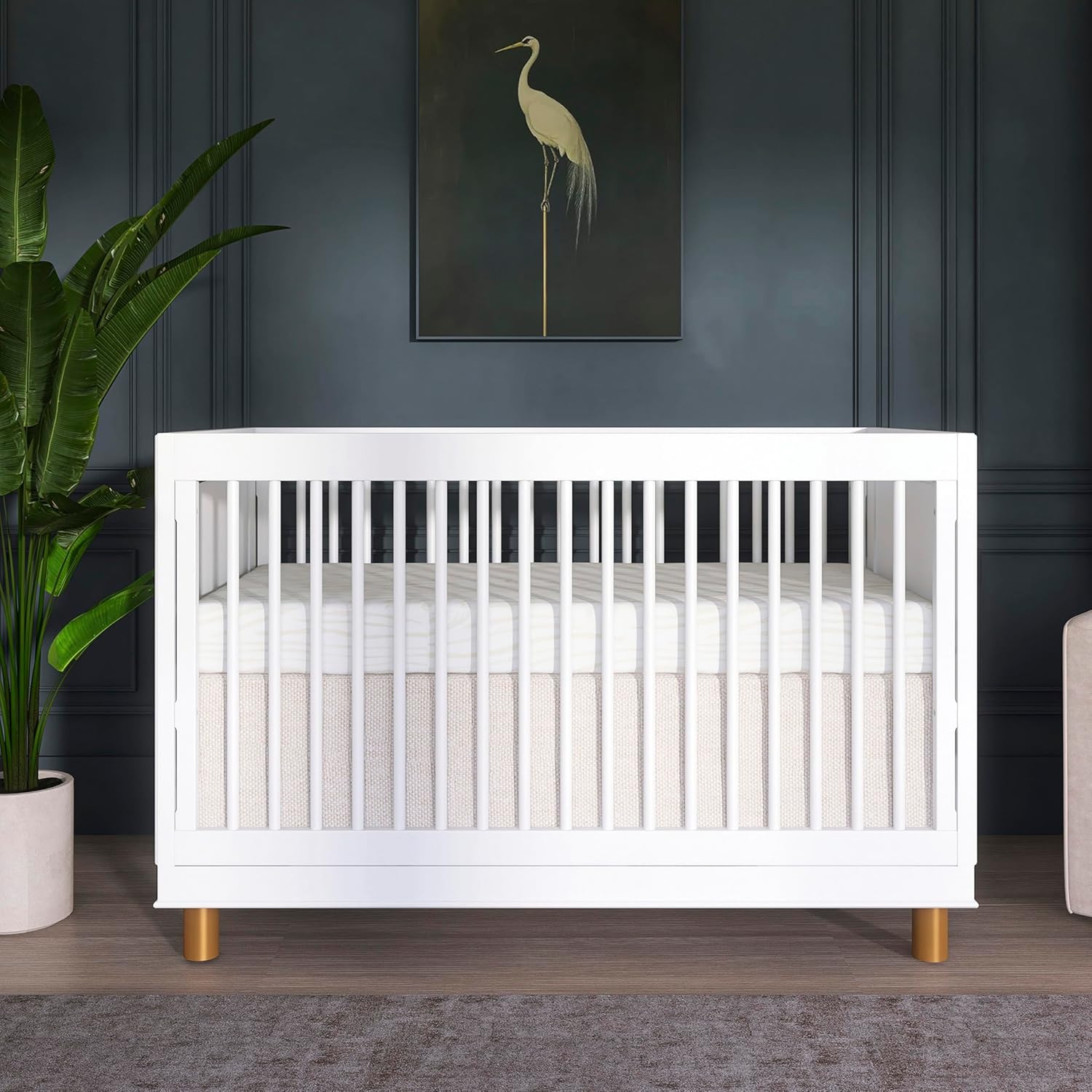 Part of the Evolur Loft Collection, the Art Deco 3-in-1 Convertible Crib features a clean, minimalistic form that has been inspired by the design aesthetics of the 1930s - the iconic Art Deco period. Perfect for fashion-forward parents, the crib features rounded spindles on a solid frame and end panels showcasing geometric art decor molding! Constructed out of kiln-dried hardwood with fine veneers, the Art Deco is built to last and is truly a lifetime investment. At Evolur, we believe in creating furniture that adapts to your growing child. The Art Deco 3-in-1 Convertible Crib does exactly that. It features 3 mattress height settings that can be adjusted depending on our child. Set it at its highest setting during the newborn months and lower it as your child starts to pull up and stand. It converts to a toddler bed with our conversion kit (sold separately) and daybed. The Art Deco is available in contemporary White (with silver color feet) and stunning Black (with golden feet) finishes that complement any color scheme. At Evolur, safety is always our No.1 priority - Our cribs are built to the highest safety standards that meet/exceed those set by the CPSC, JPMA and ASTM. Each of our cribs undergoes rigorous testing by independent laboratories for compliance with all US and Canadian crib regulations. Pick coordinating pieces from our Evolur Art Deco Nursery Collection like the Double Dresser and 3-Drawer Dresser to create a one-of-a-kind nursery. Crib dimensions are 54.75″ L x 30″ W x 45.5″ H and it weighs 74.96 lbs. For the best mattress fit, we recommend any Dream on Me or Evolur standard, full-size, non-toxic, Greenguard certified crib mattress (sold separately).