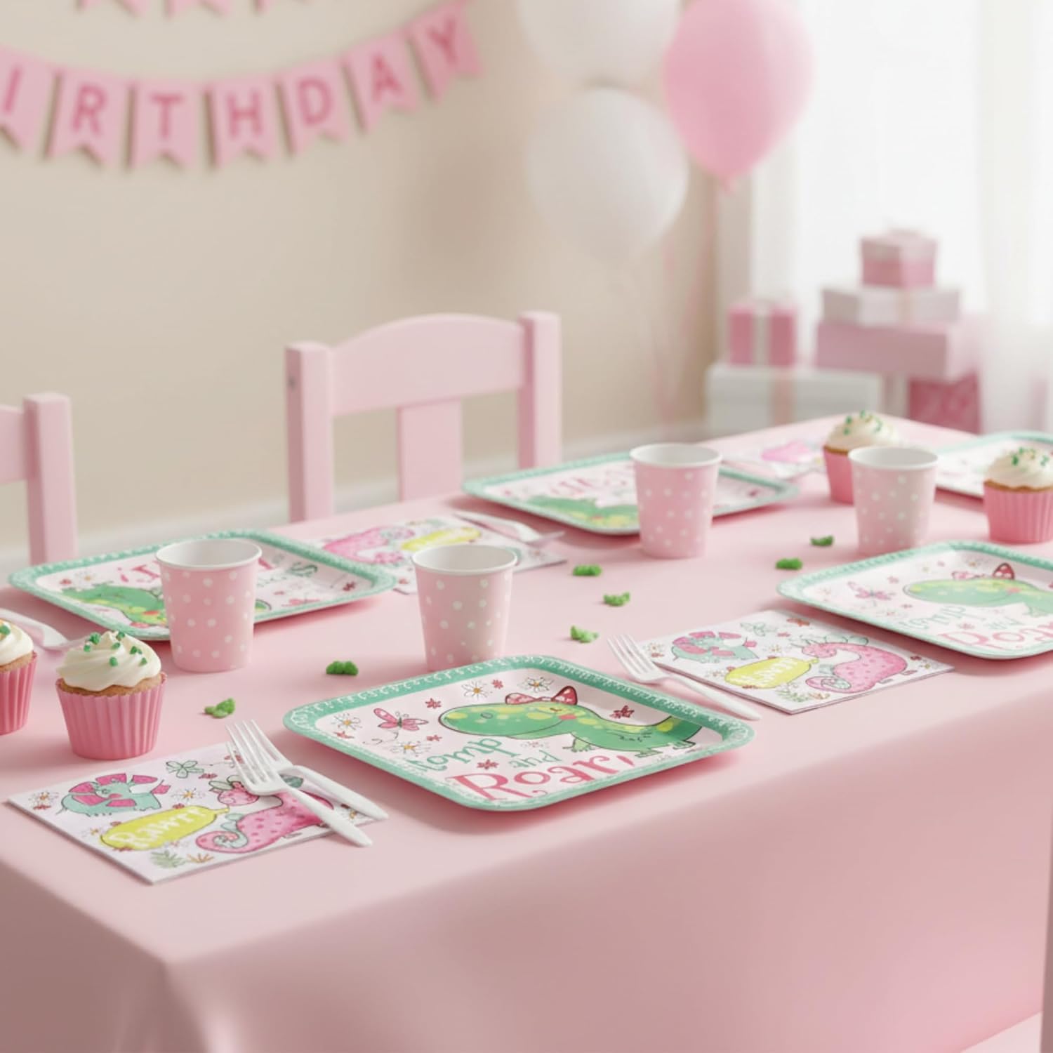 Make your girl’s special day a roaring success with this Girl Dinosaur Dinner Party Set! Serve up tasty treats on the cute plates, keep things tidy with cute matching napkins, and let little hands enjoy their goodies with matching forks. Set includes 16 of each plate, napkin, and fork, plenty for all your little paleontologist-enthusiasts. Your little dino fans will love the playful and vibrant theme, adding a prehistoric charm to any party!