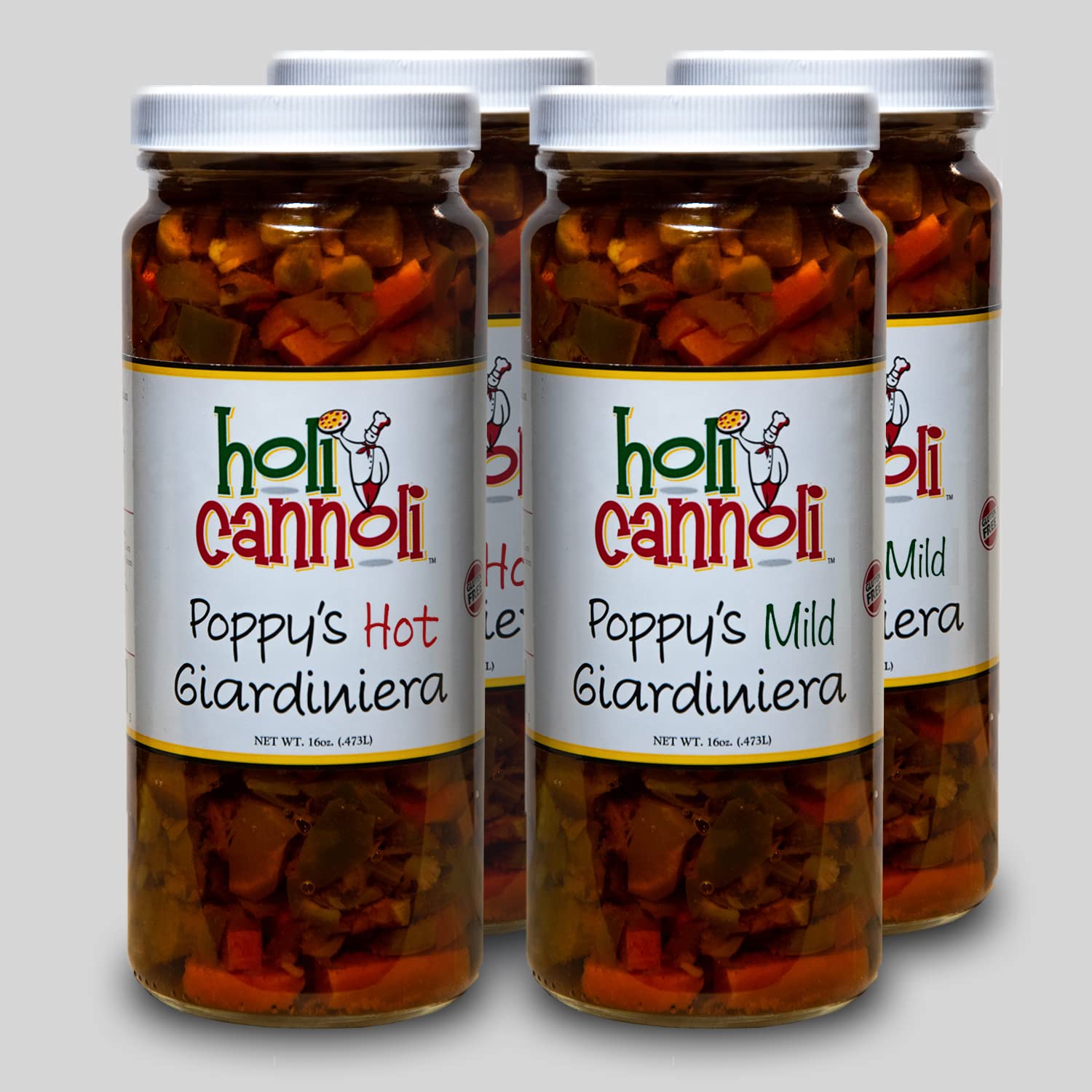 Authentic Chicago Giardiniera. Born in Chicago. Made in Chicago! An unmistakable flavor profile and palate-pleasing spiciness to a range of dishes with Poppy’s delicious Hot Giardiniera. This recipe was perfected more than fifty years ago and has delighted countless customers since then. Poppy’s one-of-a-kind blend of peppers, olives, pimentos, and garlic is a perfect complement to Italian beefs, sandwiches, burgers, nachos, pizza, and many more dishes. Ingredients: Hot Peppers, Carrots, Celery, Cauliflower, Soybean Oil, Corn Oil, Vinegar, Sliced Green Olive, Green Olive Brine, Red Pepper Flakes, Oregano Flakes Dried, Paprika Powder, Pureed Fresh Garlic, Herbs and Spices. May contain pits or pit fragments