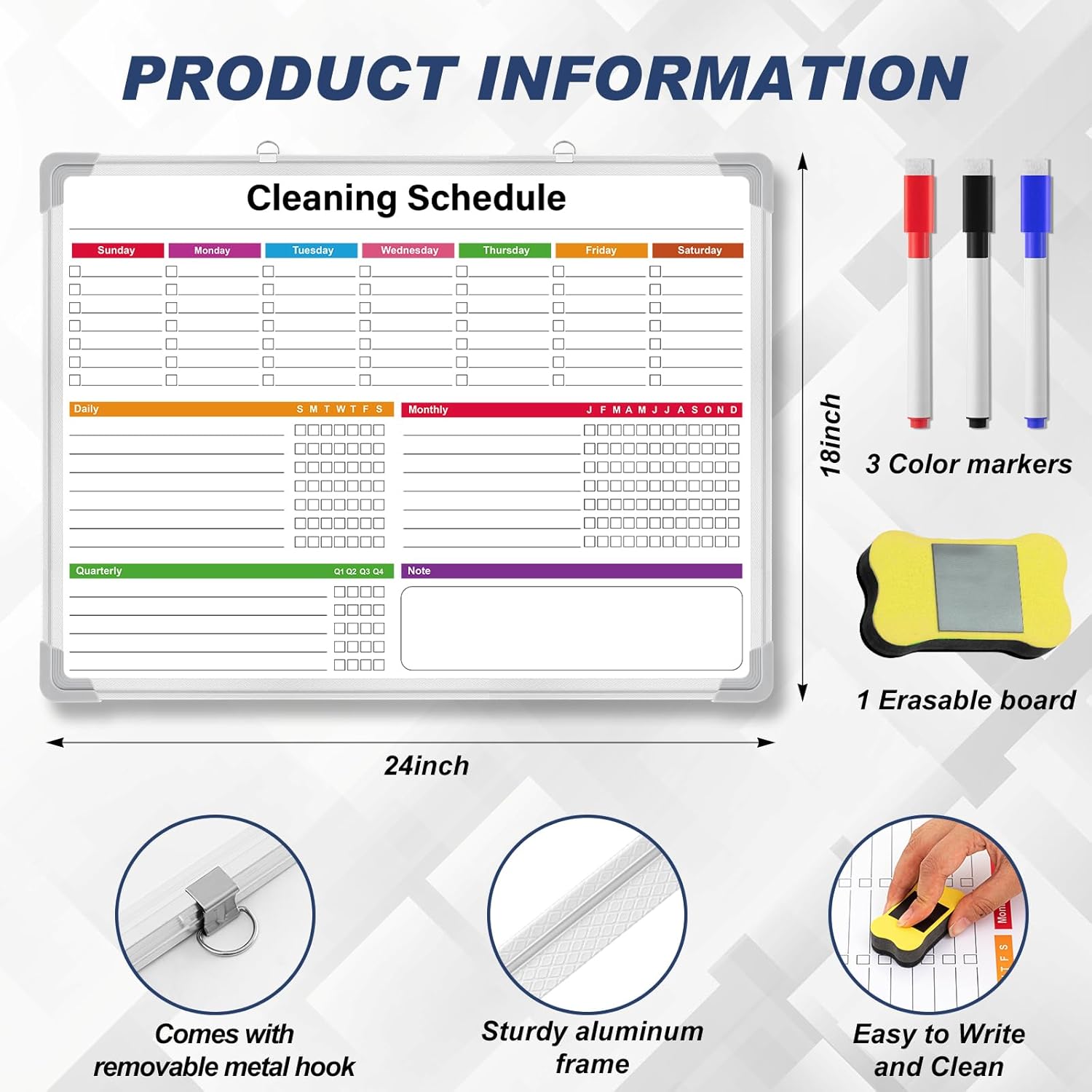 Features: Available in a variety of colors, this chore chart whiteboard adds a vibrant touch to your space. The multicolor feature is about creating a visually engaging way to manage tasks and, ultimately, reduce stress and enhance productivity. The package includes 1 dry erase whiteboard, 3 markers, and an eraser. This comprehensive set ensures you have all the tools you need to effortlessly manage your planning and organization tasks. Specifications: Material: aluminum alloy frame Color: multicolor Size: about 18 x 24 inches Package includes: 1 x Chore chart whiteboard 3 x Markers 1 x Eraser Notes: Manual measurement, please allow slight errors on size. The color may exist a slight difference due to different screen displays.
