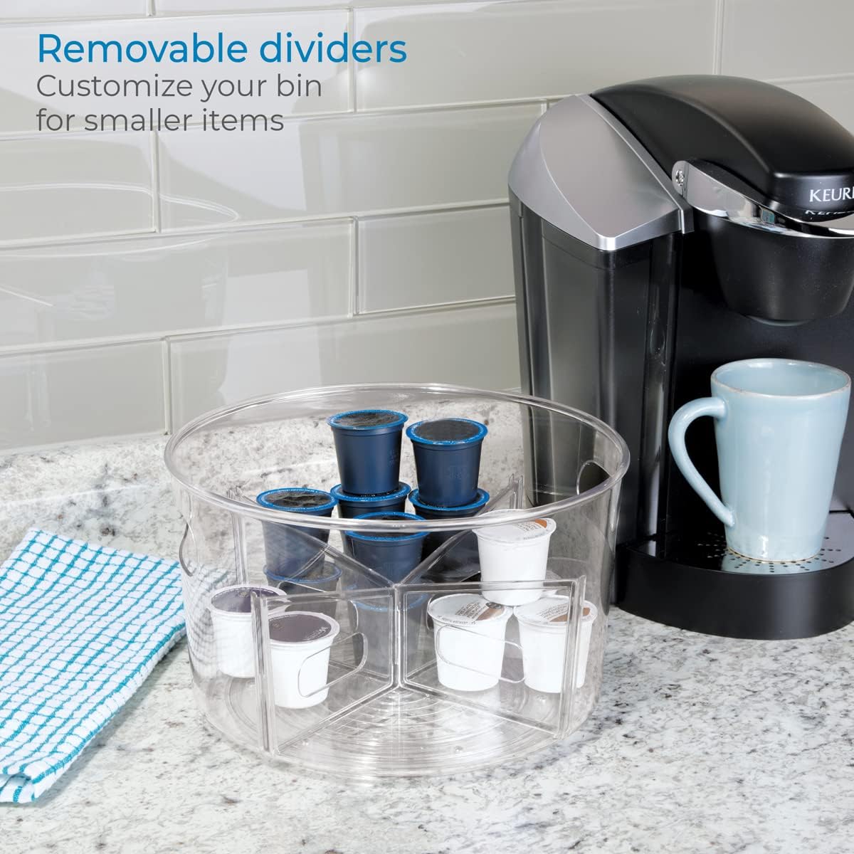 Keep kitchen necessities organized and in reach with the iDesign Linus Customizable Rotating Turntable. This rotating organizer features a roomy storage tray with four removable dividers that can be reorganized in five different ways to provide customized storage options. This spinning kitchen organizer can be used to keep a variety of items including utensils, spices, snacks, and more organized on the countertop, on pantry shelves, or in cabinets. It can also be used in the bathroom, bedroom, office, on the vanity, under the sink, or anywhere you need additional organization. Designed with style and function in mind, the open top design with raised sides keeps items easily accessible and prevents them from falling out while turning the organizer. The durable BPA-free clear plastic construction is made to last and is easy to clean with mild soap and water. Measuring 10.5" x 10.5" x 6.36", this rotating lazy Susan is ideal for adding storage in compact spaces. With iDesign by InterDesign, you can #LiveSimply every day.