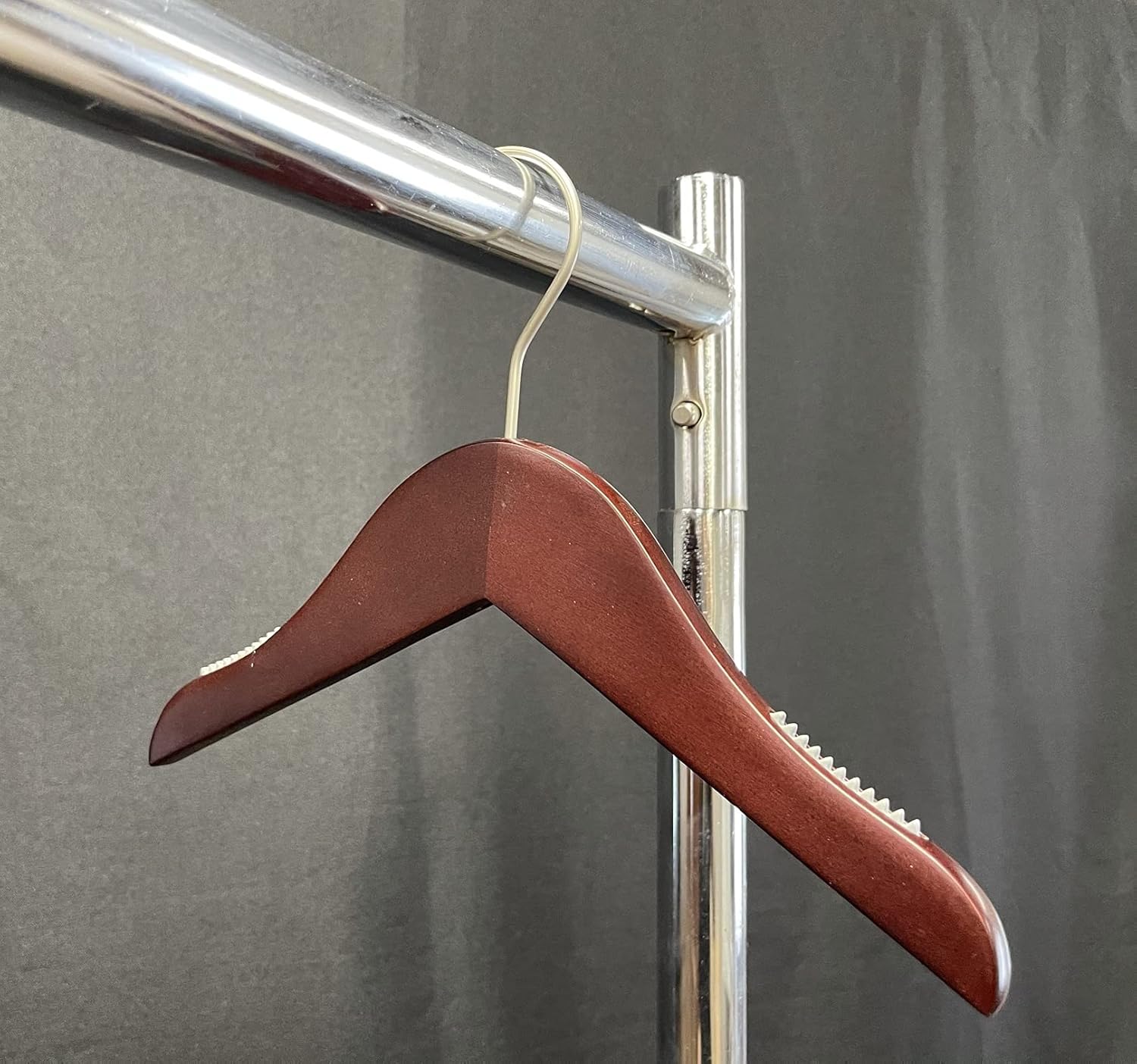 Teeny-tiny baby clothes deserve hangers just their size. Our 10” low gloss, mahogany finish wooden clothes hangers feature a brushed chrome hook and non-slip attachments on the ends of both arms, helping to keep precious baby clothes from sliding off. The flat surface makes an excellent choice for imprinting your baby’s name, date of birth, or a monogram. Qty per carton: 25