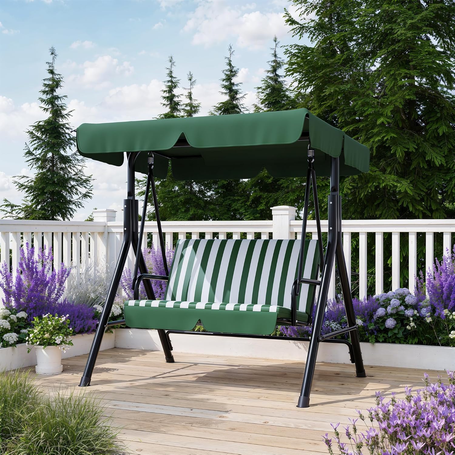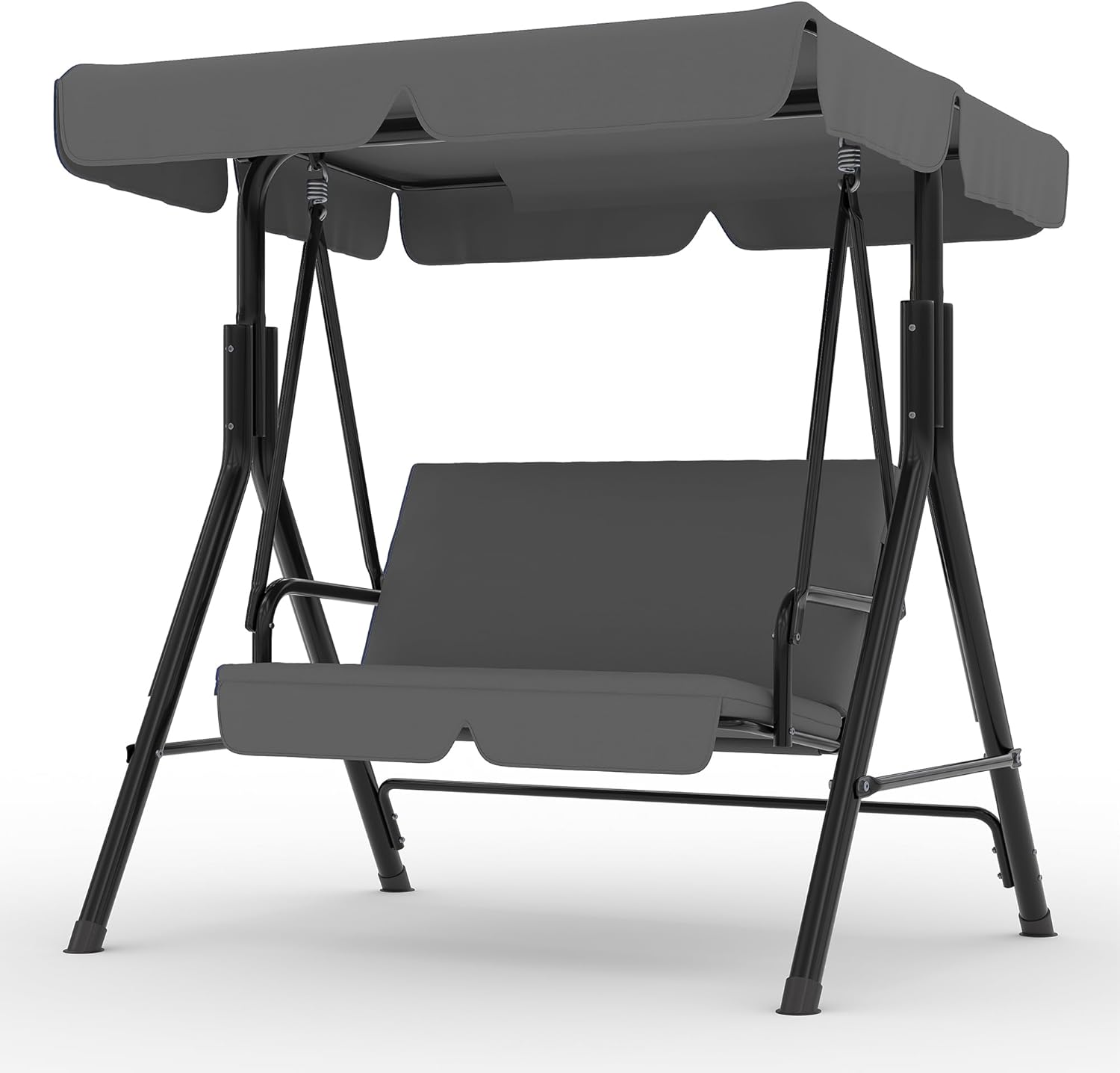 Designed with clean lines and soft, neutral tones, this outdoor porch swing adds relaxed elegance to any outdoor environment. Available in grey, khaki, sky blue, and deep blue, it complements a wide range of patio furniture styles while creating an inviting place to unwind.This patio swing with canopy features an adjustable roof that tilts up to 40°, allowing you to customize shade coverage throughout the day. The upgraded polyester fabric canopy and seat are water- and UV-resistant, offering reliable protection and comfort in outdoor settings while maintaining a smooth, supportive sitting surface.Built on a reinforced metal frame with a powder-coated finish, this porch swing chair is designed for long-term outdoor use. The triangular structural design improves stability, while the heavy-duty spring suspension system supports up to 600 lbs, delivering controlled, comfortable swinging. Ideal for patios, gardens, balconies, and poolside lounging, this outdoor swing chair brings both function and atmosphere to your space.Bring warmth and function to your outdoor living area with a patio swing made for everyday relaxation.