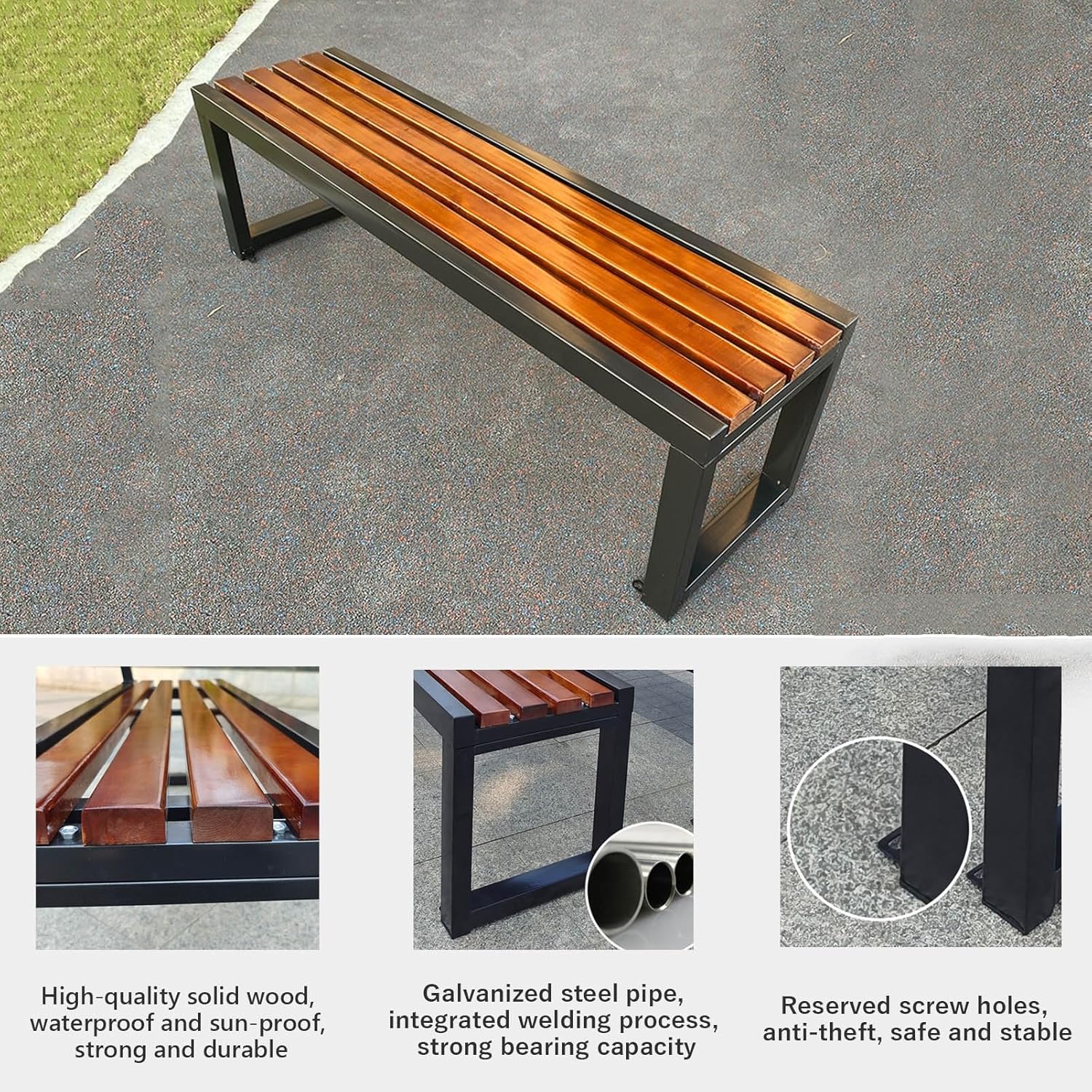 This garden bench has plenty of space and can comfortably accommodate 3-4 friends. The outdoor patio bench is suitable for outdoor spaces such as parks, balconies, porches and patio areas.Name: Outdoor Garden BenchColor: BrownMaterial: Wood, Galvanized Steel PipeSitting Height: 45cmProduct Size: 120/150/180 x 40 x 45cmLoad Capacity: 400kg✔ Suitable for courtyards, gardens, backyards, lawns, etc.✔ Breathable slatted seats provide a comfortable ride.✔ Wear-resistant plastic legs, non-slip, will not damage the floor.✔ Reserved screw holes, anti-movement, anti-theft, safe and stable.Package Contents:1 x Garden Bench