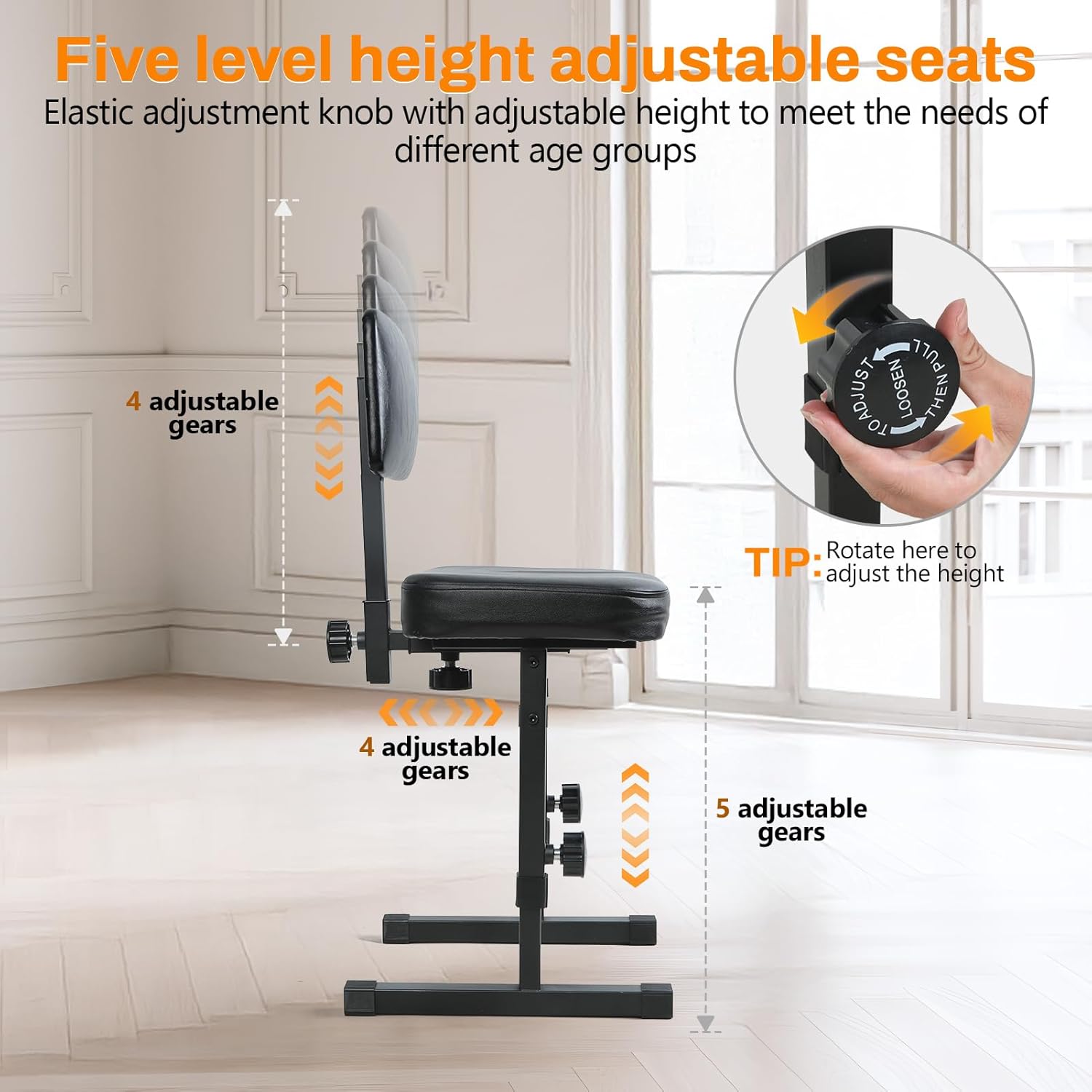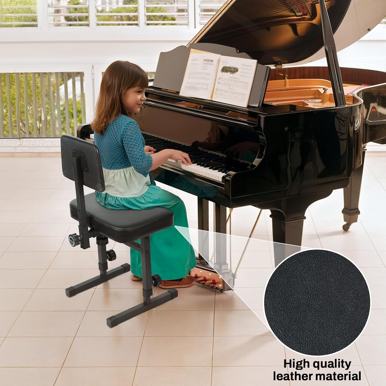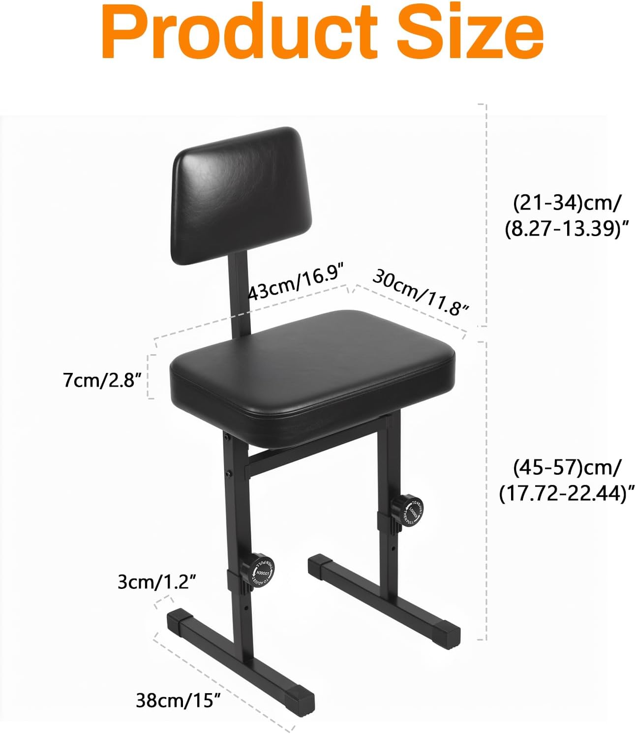 Description: Item Name: Piano Bench Material: Iron, Sponge, Faux Leather Features: Heavy Duty, Anti-Slip, Adjustable Height Size Details: L: 43cm/16.93", W: 38cm/14.96", H: 91cm/35.83" (Approx.)Notes: Due to the light and screen setting difference, the item's color may be slightly different from the pictures. Please allow slight dimension difference due to different manual measurement.Package Includes: 1 x Piano Bench 1 x English Manual