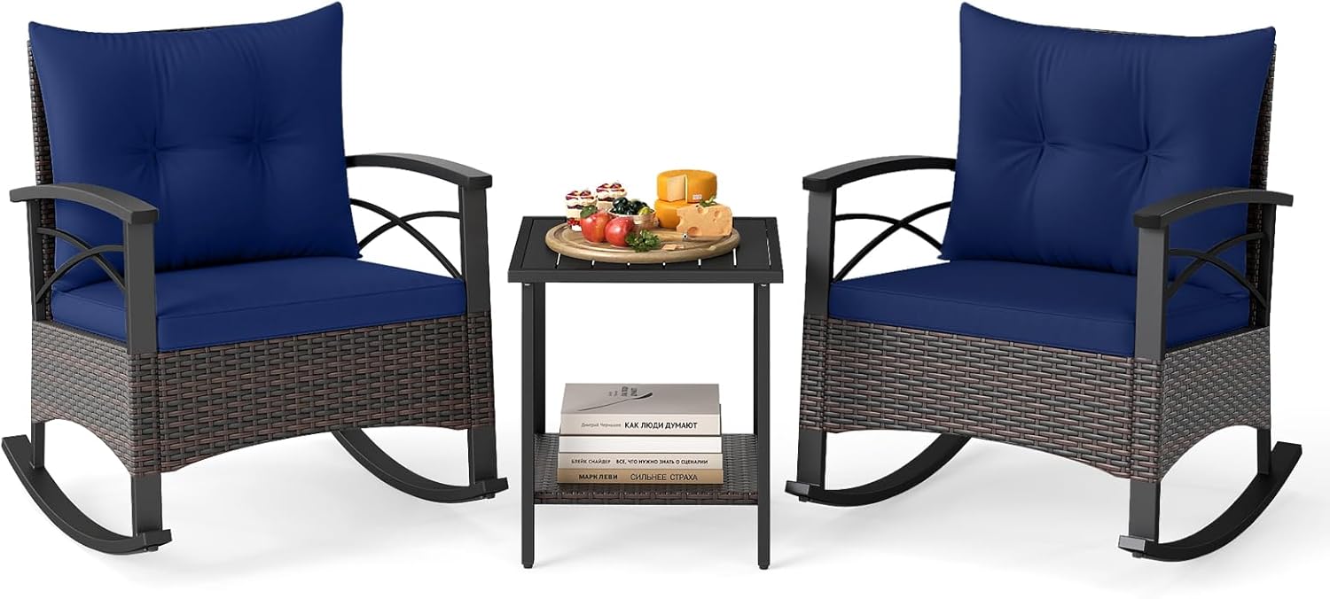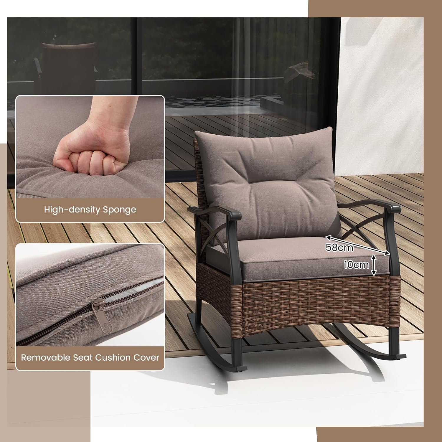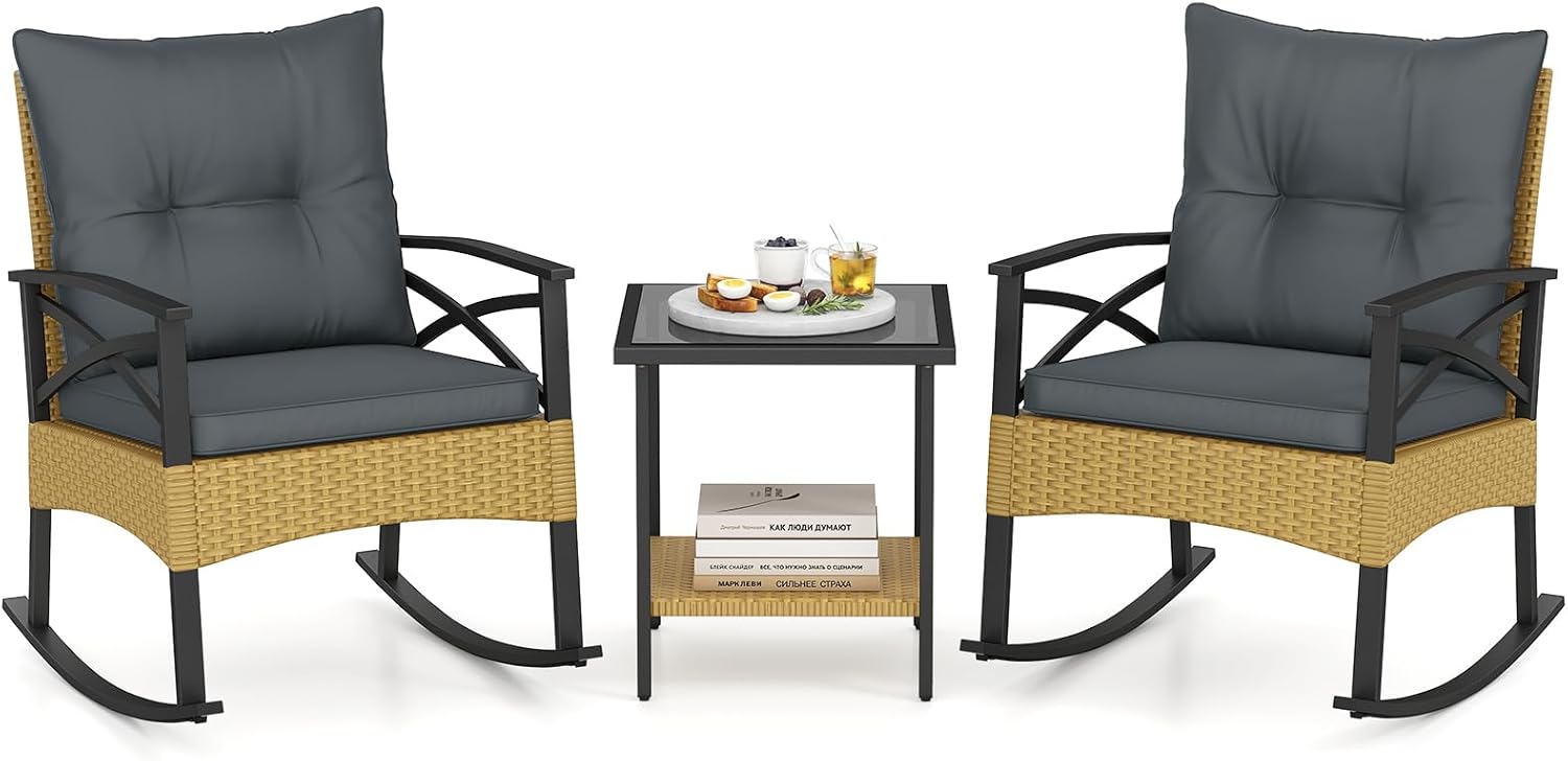 Description: Create a personal retreat that speaks volumes of comfort and style with our 3-piece patio rocking bistro set!This outdoor conversation set, made of fade-resistant and breathable PE rattan and a heavy-duty metal frame, is long-lasting for use and stable for support. Featuring 2 rocker chairs with soft and thick cushions, you can sway in comfort and stability, thanks to the innovative anti-slip pads and safety stoppers. The 2-tier side table offers ample space to store refreshments and essentials. Features: The hand-woven PE rattan is fade-resistant and sun-protective for durability Ensure a stable structure with a heavy-duty metal frame Gently lull you into a state of tranquility with a smooth rocking motion Keep balance with anti-slip pads and stoppers Quiet rocking for a better user experience Thickened cushion with high-density sponge for upgraded comfort Easy to clean thanks to the removable seat cushion cover Please always keep cushions dry to prolong the service time Tempered glass tabletop and extra storage shelf for ample storage space Suitable for porch, balcony, garden and backyardSpecifications: Color of Rattan: Mix Brown Color of Cushion: Gray Material: PE Rattan, Metal, Tempered Glass, Fabric, Sponge Dimensions of Coffee Table: 18”x 18”x 19”/46 x 46 x 48 cm (L x W x H) Dimensions of Each Chair: 32”x 25.5”x 31”/82 x 65 x 80 cm (L x W x H) Dimensions of Each Seat Cushion: 23”x 23” 4”/58 x 58 x 10 cm (L x W x Thickness) Dimensions of Each Back Cushion: 24”x 21”x 5”/60 x 53 x 12 cm (L x W x Thickness) Seat Height: 14”/36 cm Seat Depth: 23”/58 cm Total Net Weight: 57 lbs/26 kg Weight Capacity of Coffee Table: 110 lbs/50 kg Weight Capacity of Each Chair: 400 lbs/180 kg Package Includes: 1 x Table 2 x Chairs, 2 x Back Cushions 2 x Seat Cushions 1 x Instruction