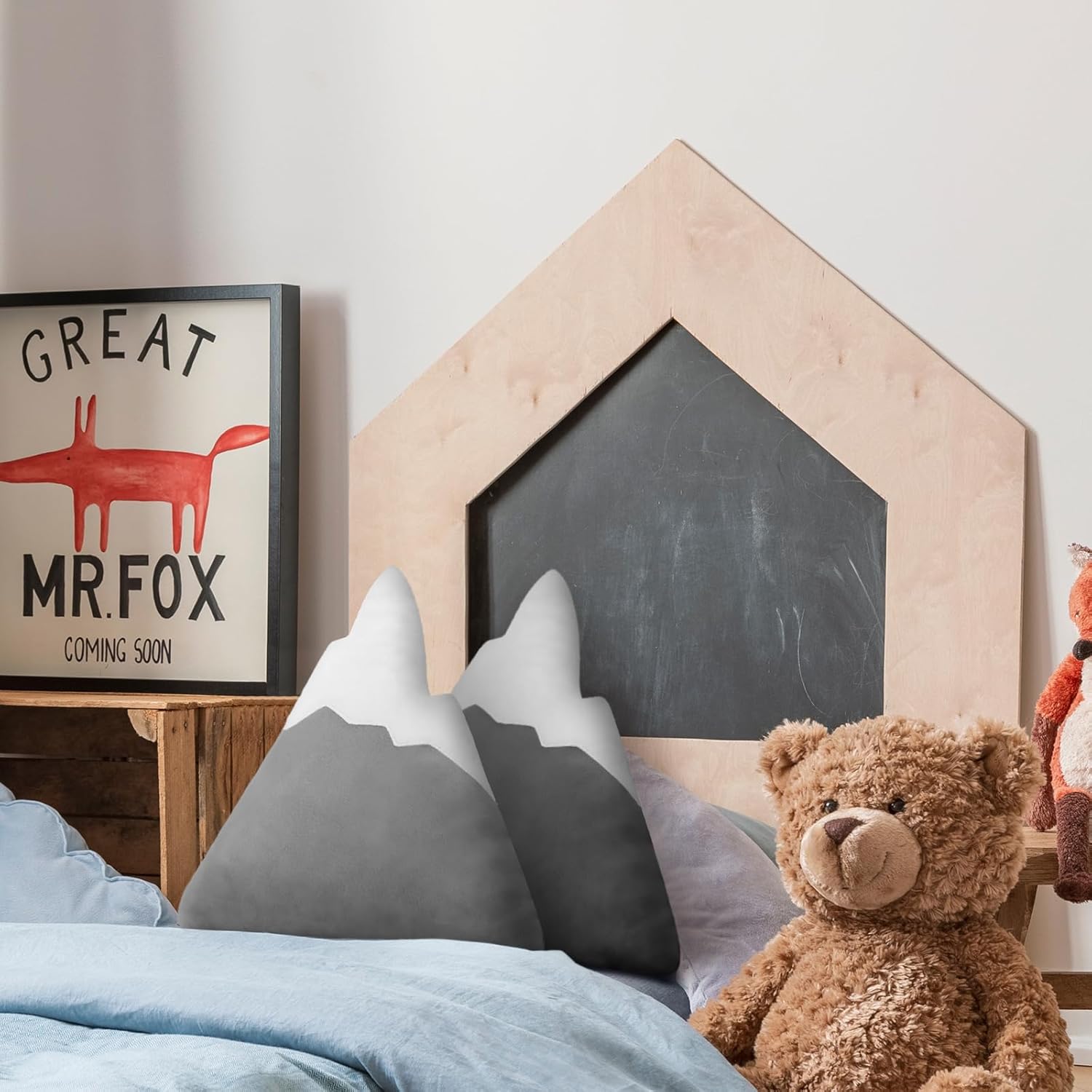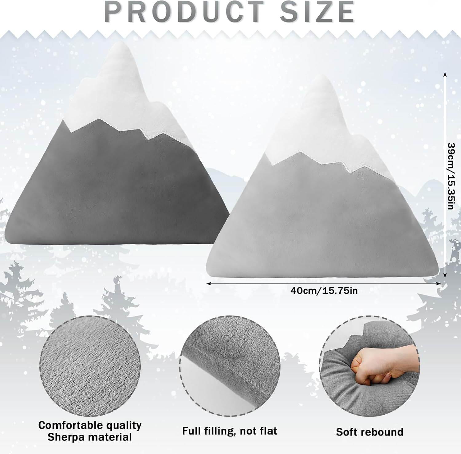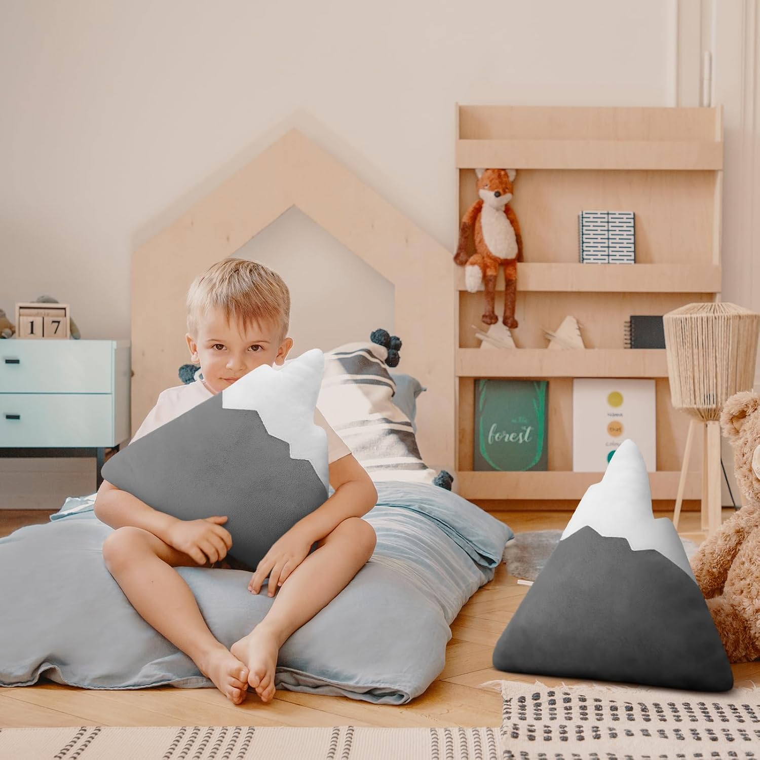 Features: This nursery pillow not only serve as a decorative item but are an embodiment of love and warmth. Making them a nice accessory as an adorable addition for any toddler or little kid's room. Get ready for a bear hug! These pillows come in a beautiful combination of gray and white colors, seamlessly complementing and enhancing the decor of a nursery or a kid's room. The subtle colors add a touch of sophistication to your interiors. Specifications: Material: cotton velvetColor: gray, whiteSize: about15.75 x 15.35inches/ 40 x 39 cmPackage includes: 2 x Mountain shaped decorative pillow Notes: Manual measurement, please allow slight errors on size. The color may exist a slight difference due to different screen displays.