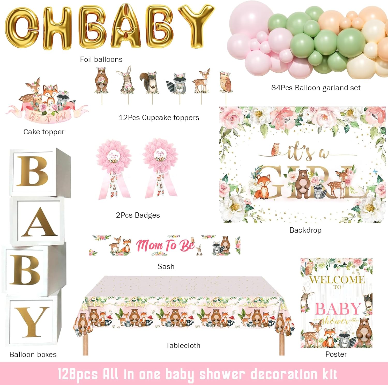 | Included Components | Forest Animal Tablecloth, Boxes, Cake Topper, It’s a Girl Backdrop, OH BABY Foil Balloons, Mom To Be Sash, Pins, Signature Book, Pink & Green & Apricot & Ivory Balloons, Woodland Baby Shower Decorations Girl |
